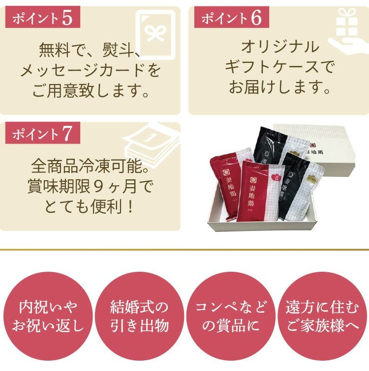 ⑤長年の実績大正14年の創業。街のお肉屋さんから始まり、多くの方々に応援していただき、現在は3代目を中心に全国に【妻地鶏】を発信させていただいております。そして時代のニーズに合わせて、さまざまな加工品にも挑戦しておりますが、【妻地鶏】の飼育、加工へのこだわりはそのままに、今後も皆様に愛される【妻地鶏】を守っていきたいと考えております。 |